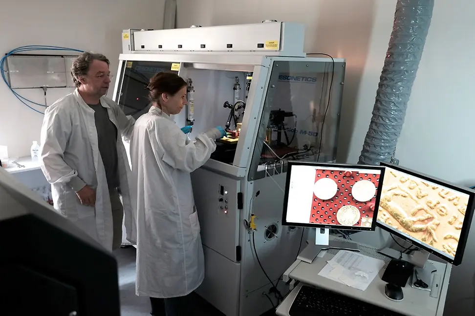 The Raman spectroscope's special power is that it can analyse minute quantities of solid or amorphous substances - the minerals in pigments, for example - without damaging the object, and can be used in relatively normal atmospheric conditions.